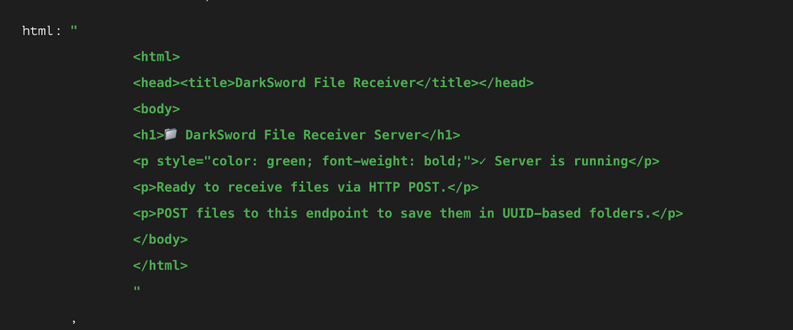 The C2 domain is hardcoded in DarkSword and exfiltrated data is sent to ports 8881/8882 which host a “DarkSword File Receiver” endpoint. The use of BaseHTTPServer together with the HTML content served by this endpoint indicates that server-side code may have been included in the sale of DarkSword for demonstration purposes, or was created by the threat actor themselves. There are indicators that this part of the DarkSword infrastructure was created with assistance from an LLM such as a folder emoji in the heading and a checkmark symbol.