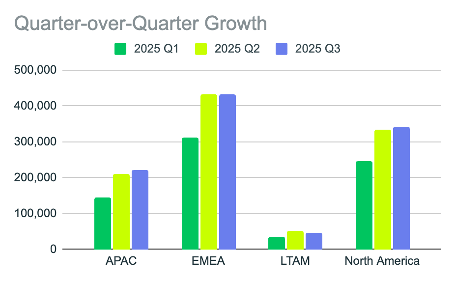 This distribution suggests that while EMEA continues to sustain high absolute volume, infrastructure expansion and attacker growth are occurring fastest in APAC and LATAM.